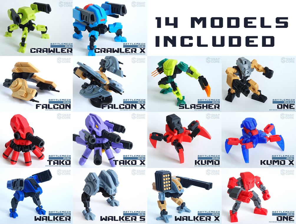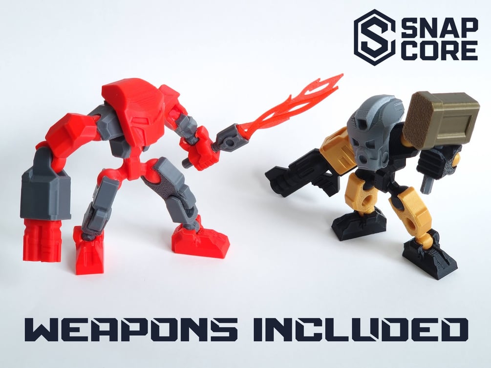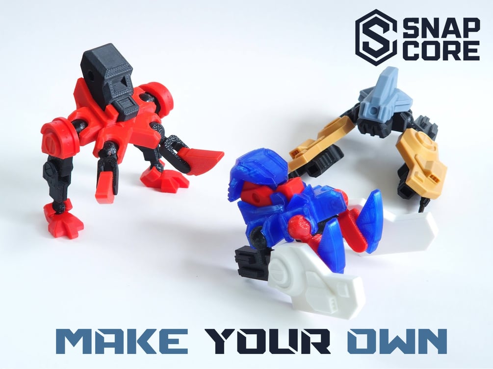 SnapCore™ is a 3D-printable system of interchangeable parts that lets you create, customize, and play with your own mech figures. Every piece works together, so you can mix, match, and upgrade across the entire SnapCore line.